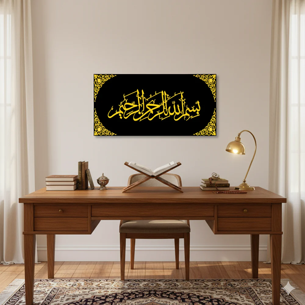 Enhance the beauty of your home or workspace with this elegant Bismillah ir Rahman ir Rahim Acrylic Islamic Wall Art. Designed with a deep black background and striking gold Arabic calligraphy, this piece delivers a luxurious and spiritual presence wherever it is displayed. The decorative Islamic corner patterns add a refined and timeless touch.
