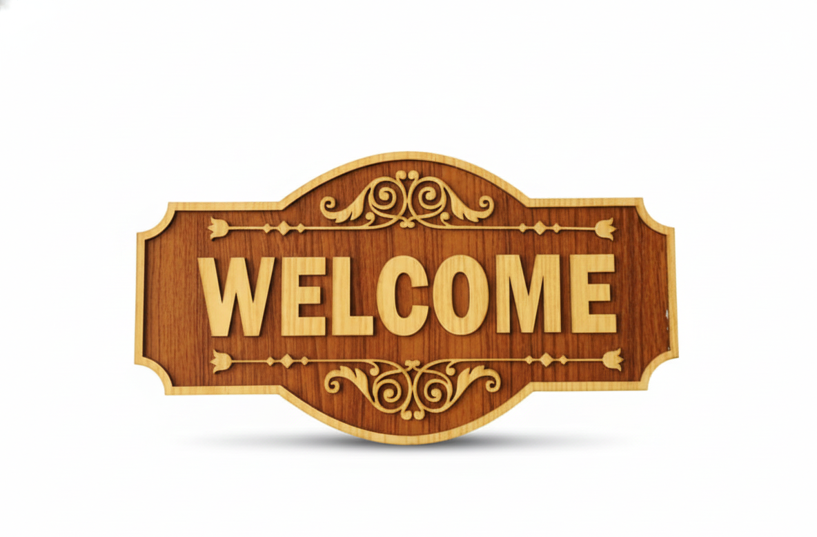 The bold “WELCOME” lettering is beautifully framed with intricate scrollwork and decorative accents. A rich wood-grain textured finish gives it the look of natural wood, while precision-cut carved-style details add depth and character—without the weight or cost of solid wood.