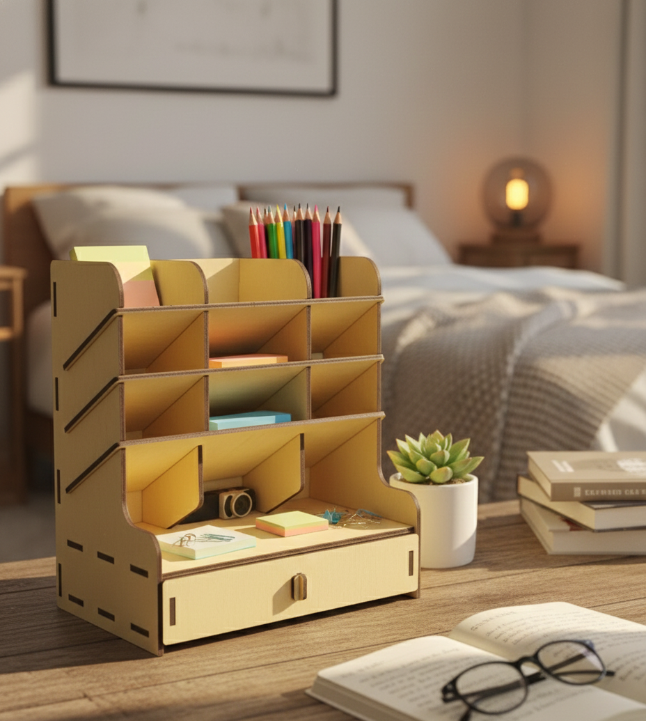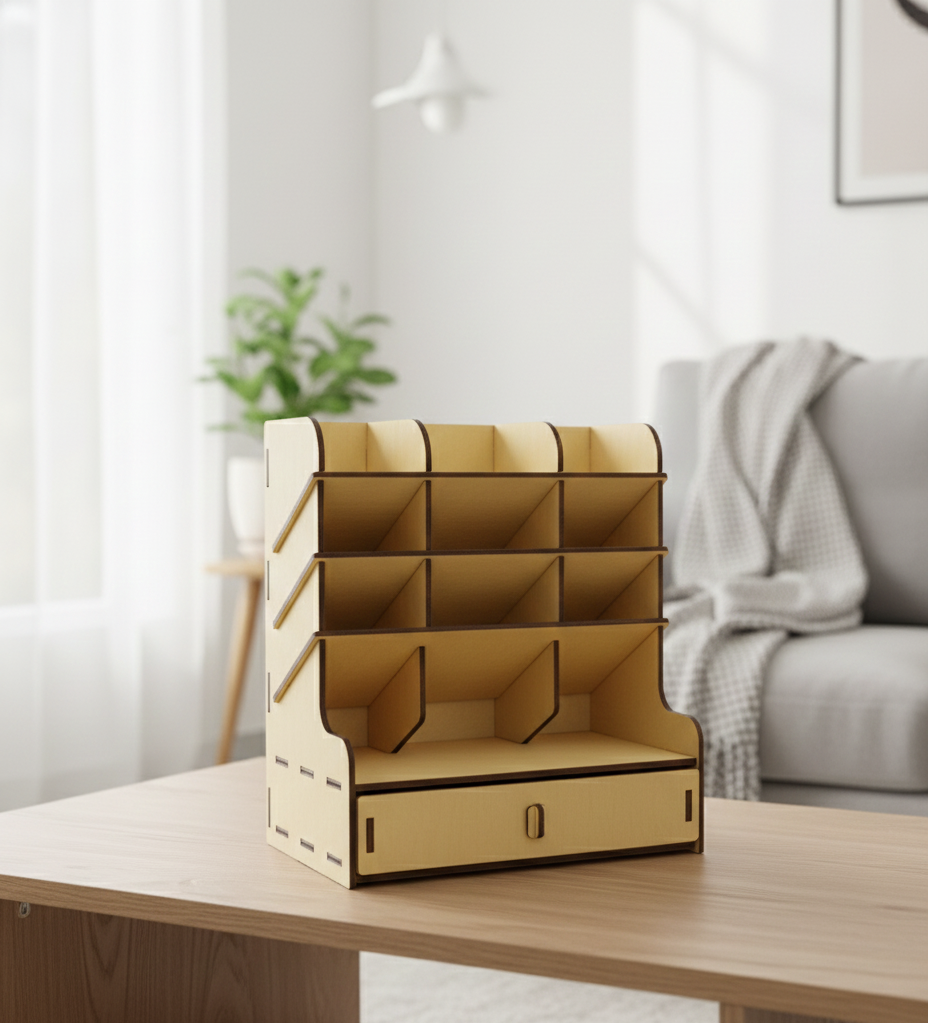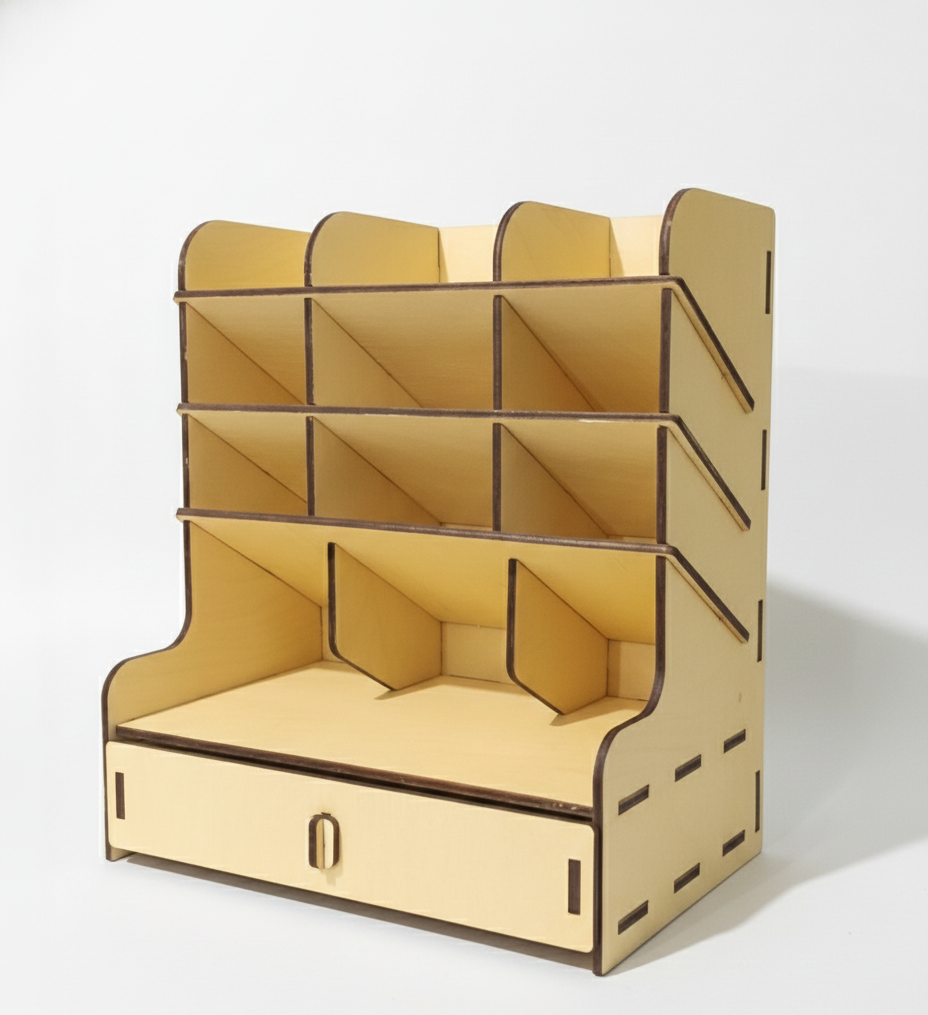 The natural light wood finish adds warmth and a minimalist touch, making it suitable for offices, study rooms, or creative spaces. Its smart tiered layout includes multiple open slots of varying sizes for documents, notebooks, sticky notes, and files, along with upright sections for pens and markers. The bottom pull-out drawer offers concealed storage for small items like clips, staples, or personal accessories, keeping your desk clutter-free and visually appealing.