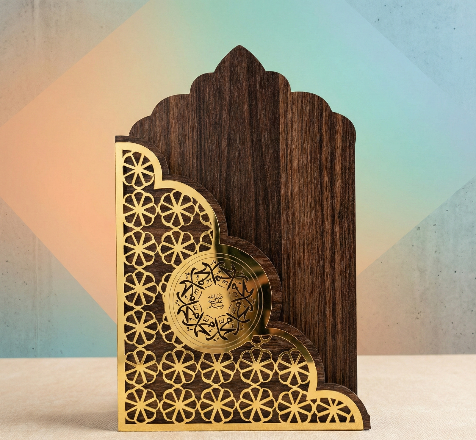 Crafted from high-quality MDF (Medium-Density Fibreboard), the stand features a rich, dark wood grain finish that exudes warmth and traditional charm. Its distinctive arch-top silhouette is inspired by traditional Islamic architecture. The front is adorned with intricate laser-cut geometric or floral patterns in dazzling golden mirror-finish acrylic, creating a striking contrast against the dark wood. A central golden medallion with delicate calligraphy or further intricate patterns completes the opulent look.