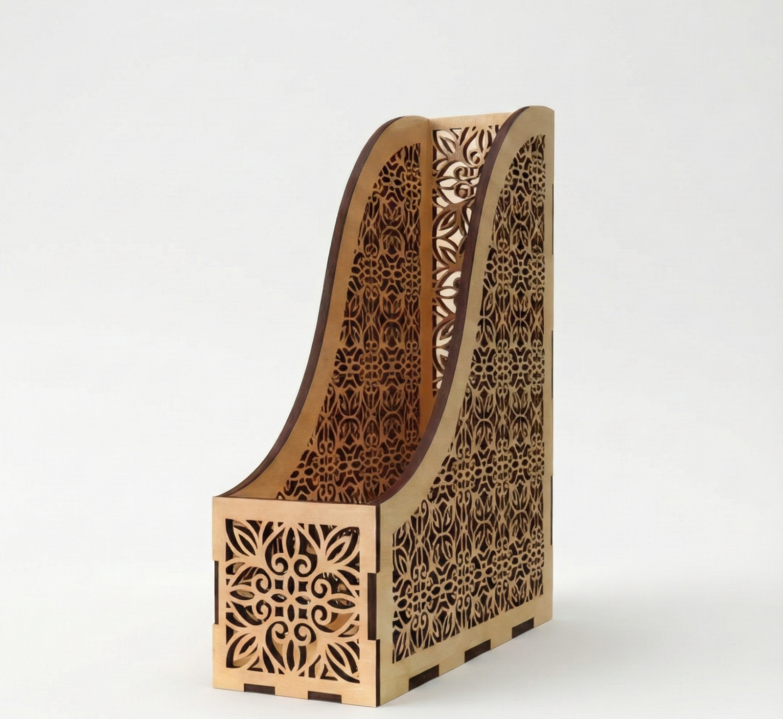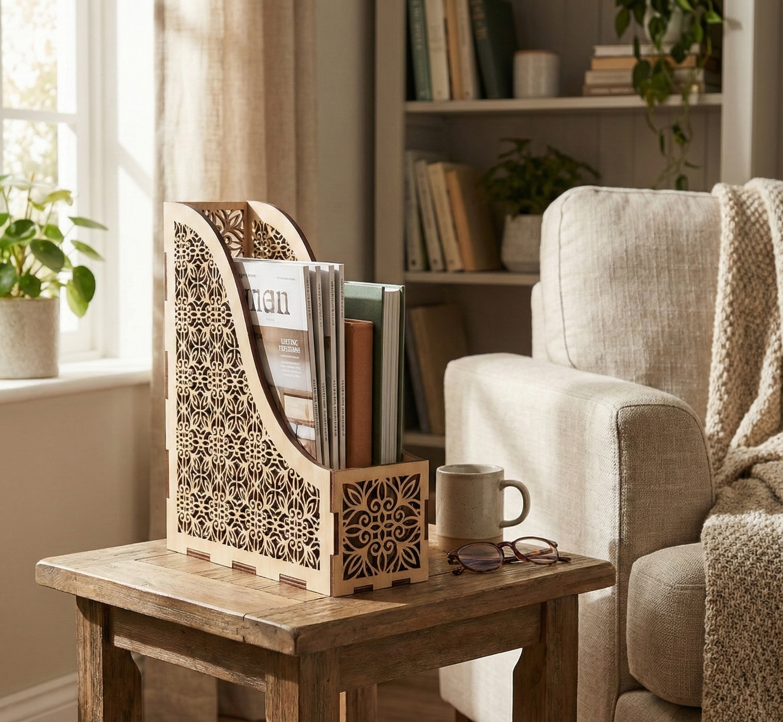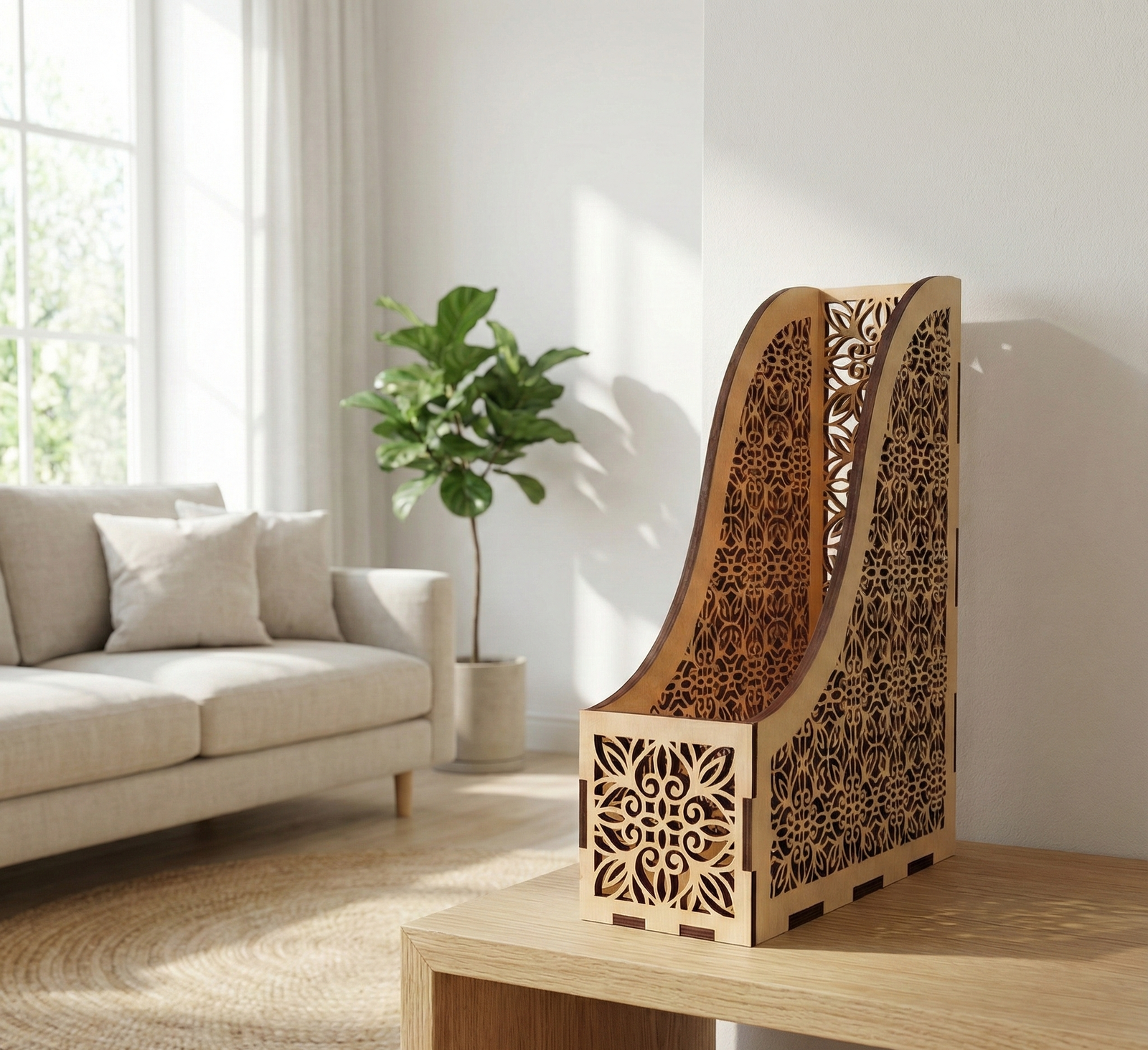 This magazine / file holder is made only from MDF and is designed for neat, stylish organization of magazines, files, and documents. Precision laser cutting creates an elegant decorative pattern that enhances both functionality and appearance. The MDF construction gives it a solid, clean, and professional look, making it suitable for home, office, or study spaces.