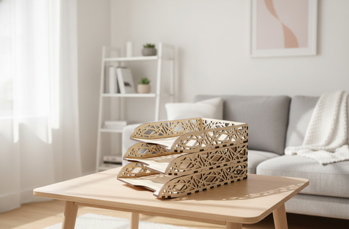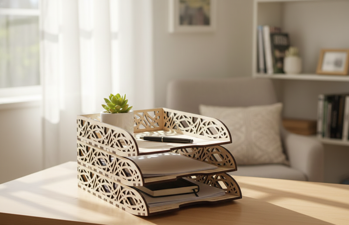 Bring refined organization and artistic charm to your workspace with this Elegant Laser-Cut 3-Tier Paper / File Tray. Designed to keep documents, letters, notebooks, and files neatly arranged, this organizer helps maintain a clean and efficient desk setup.