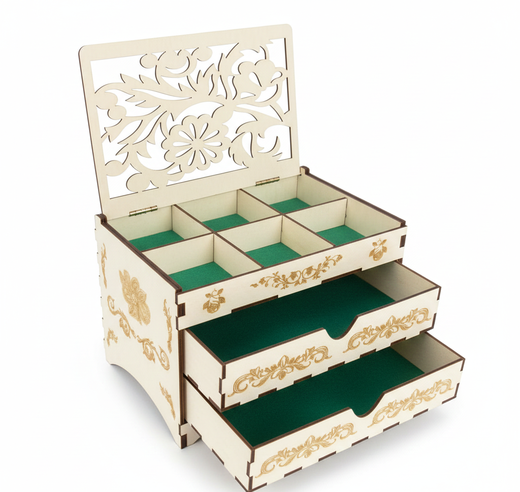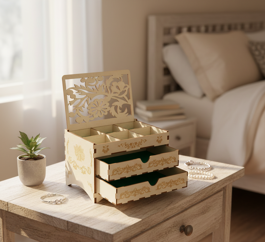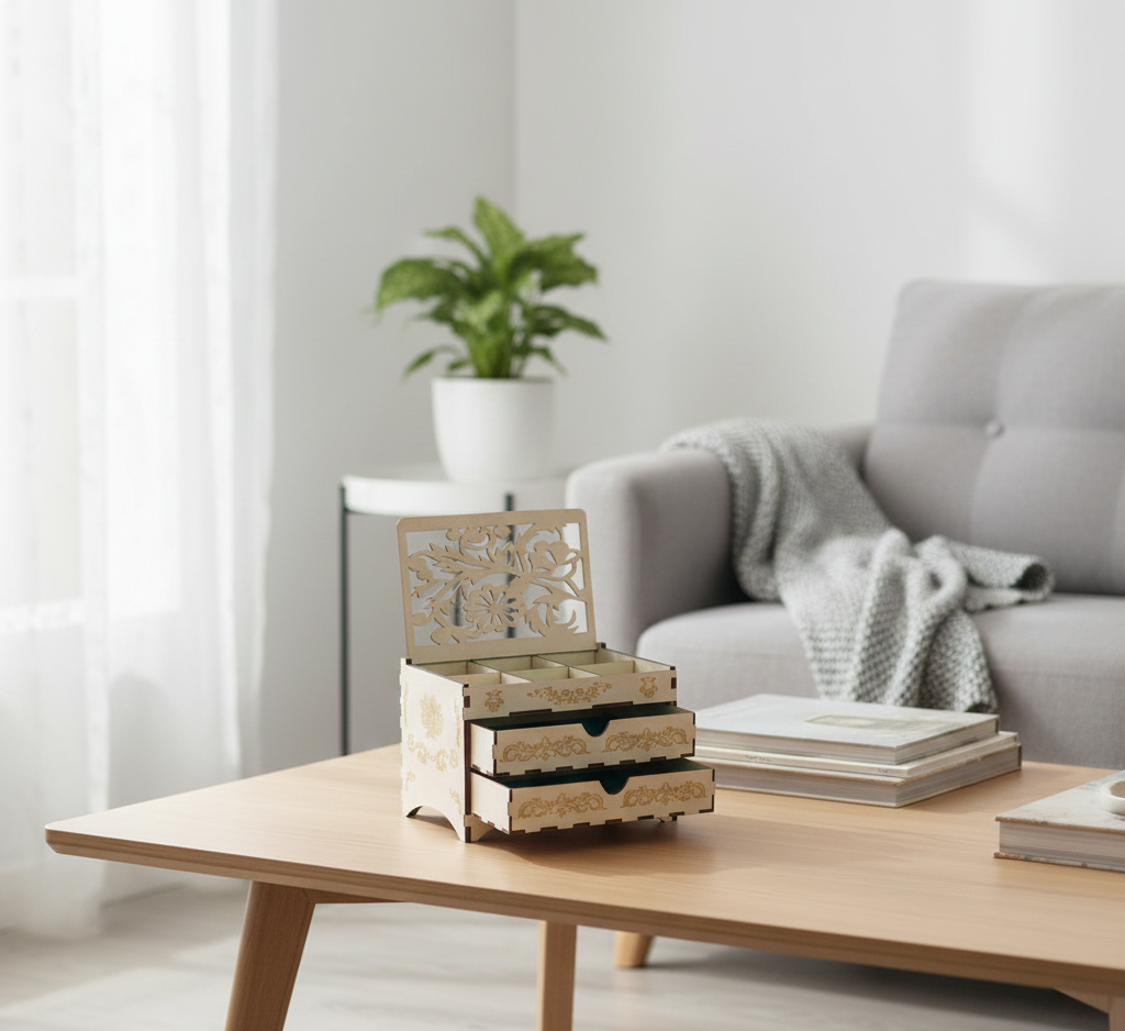 Crafted from high-quality MDF, the organizer features beautifully detailed laser-cut floral or ornamental patterns on the lift-up lid and drawer fronts. These precise cutouts create a delicate, handcrafted appearance while maintaining durability. The natural light wood finish gives the piece a warm and timeless look that complements both modern and traditional interiors.