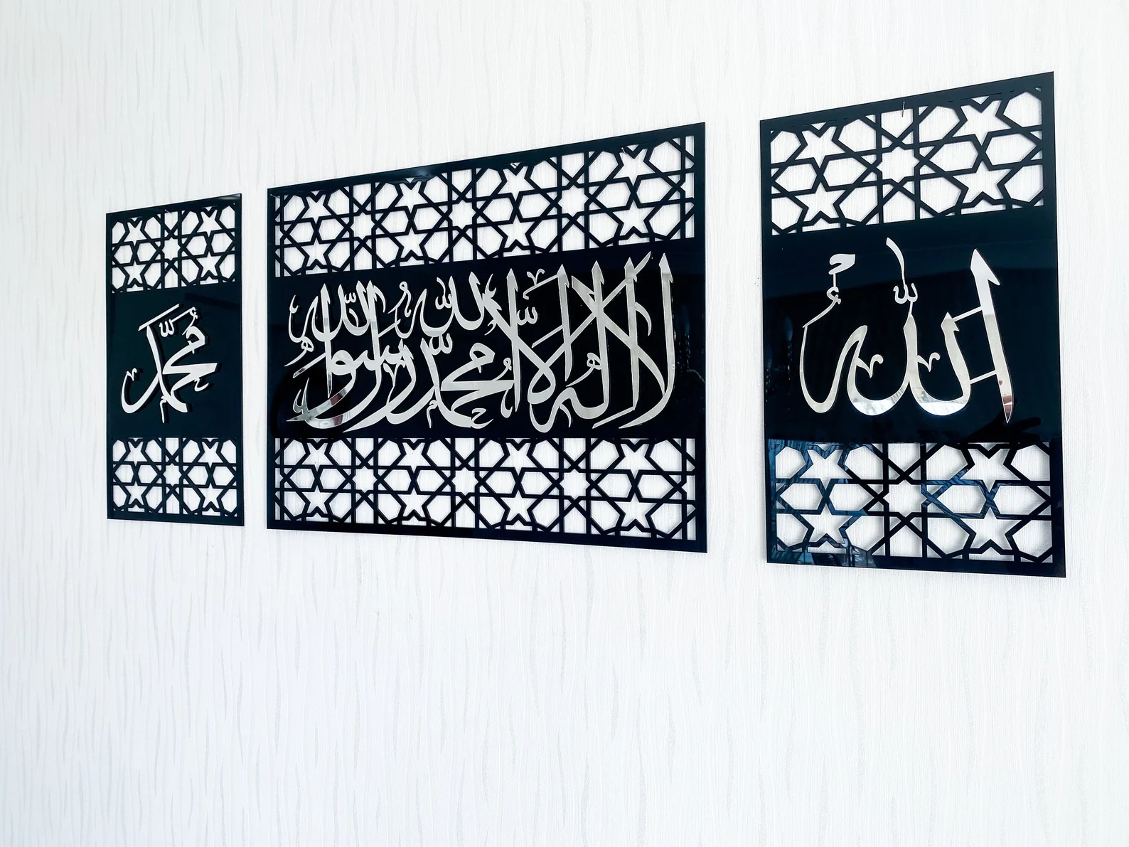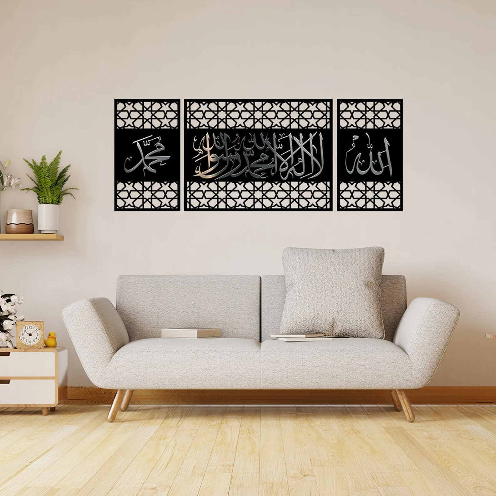 Enhance your home with the powerful message of faith through this beautifully crafted Islamic Wall Art featuring Kalima Tawheed, Allah, and Muhammad. Made from high-quality MDF wood, this elegant piece combines spiritual significance with a refined design, creating a meaningful focal point for any Muslim home. Its long horizontal size makes it perfect for walls, entrances, and prayer areas, adding peace and barakah to your space.