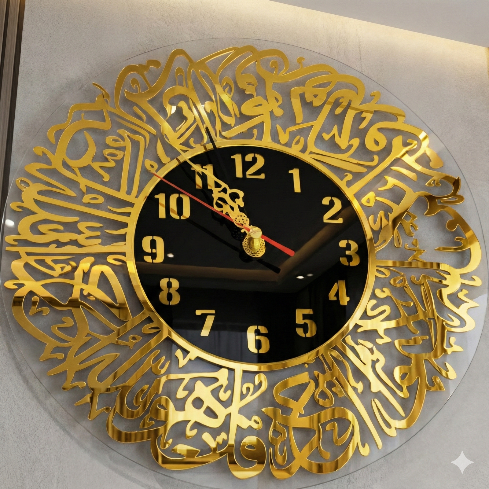 Add elegance and spiritual beauty to your space with this Luxury Golden Acrylic Islamic Wall Clock. Crafted from high-quality glossy acrylic, this clock features a stunning mirror-gold calligraphy design with a deep black center for a premium look. Perfect for modern homes, it blends faith, style, and functionality in one beautiful piece.