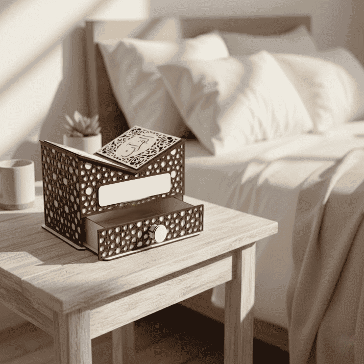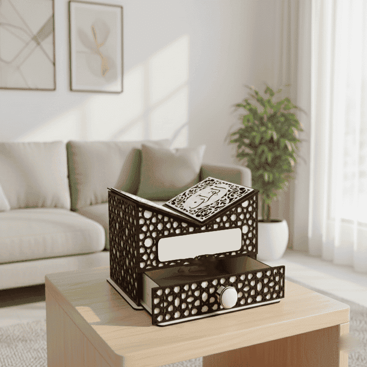 This premium Islamic Quran Stand combines traditional elegance with modern craftsmanship. Made from high-quality black MDF and finished with detailed laser-cut patterns, it provides a stylish and respectful way to place the Holy Quran. The stand includes a smooth-sliding storage drawer, ideal for keeping tasbih, prayer beads, small books, or other accessories. Its durable construction and premium finish make it an excellent addition to any Islamic home décor or a thoughtful gift for special occasions.