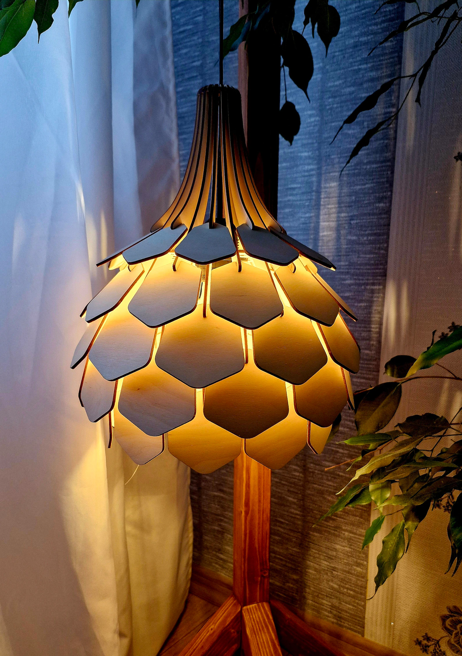 Add warmth and modern elegance to your interior with this beautifully crafted Scandinavian Pine Cone Style Wooden Floor Lamp. Made from premium MDF wood, this lamp features a layered, pine-cone inspired design created through precision laser cutting. The overlapping wooden panels softly diffuse warm light, creating a cozy and relaxing ambiance. This is a fully finished physical lamp, ideal for stylish home décor and ambient lighting.