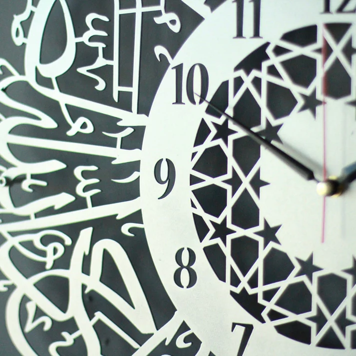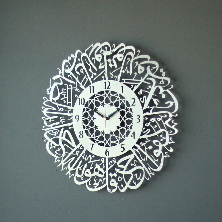 - Design: Features Surah Al-Ikhlas in beautifully detailed Arabic calligraphy, paired with a functional wall clock